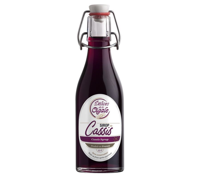Sirop de cassis artisanal, fabriqué à Mèze, élaboré à partir de jus de cassis, sans conservateurs, sans colorants.